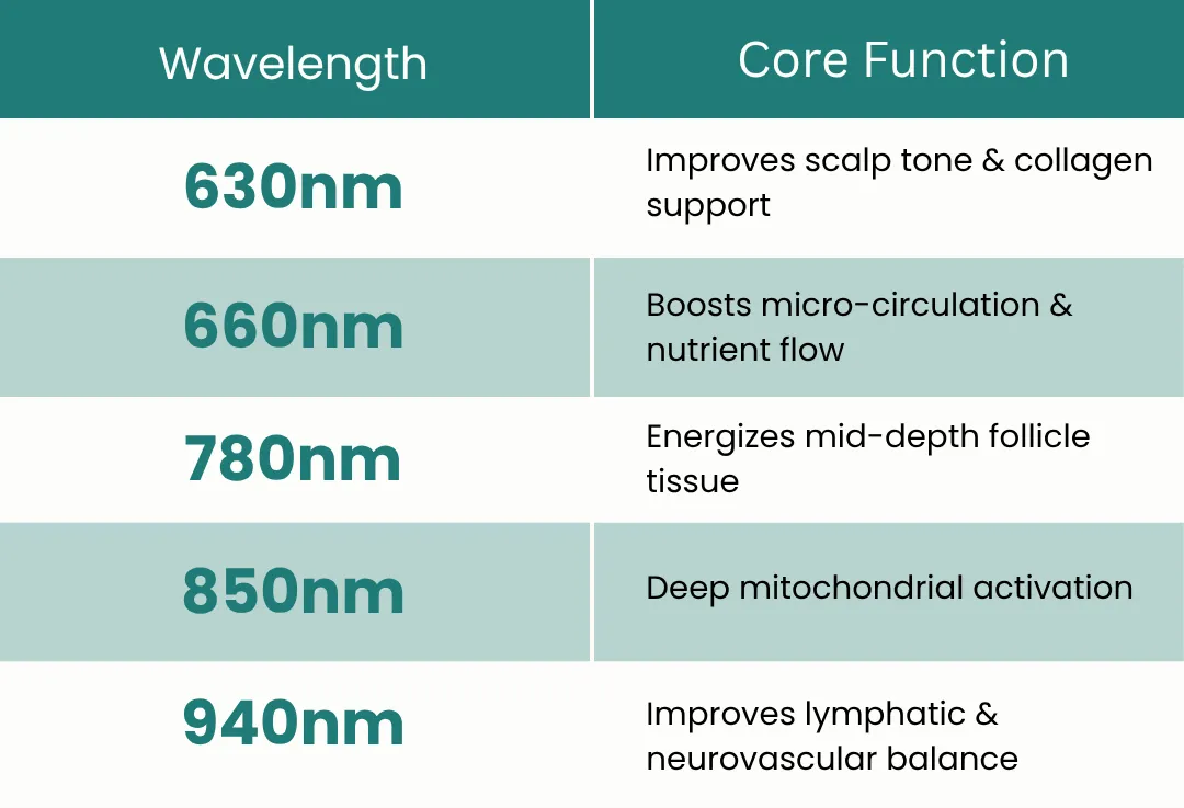 Chronic stress chokes circulation and inflames follicles. 850 nm & 940 nm wavelengths calm the nervous system, balance cortisol, and restore scalp vitality.