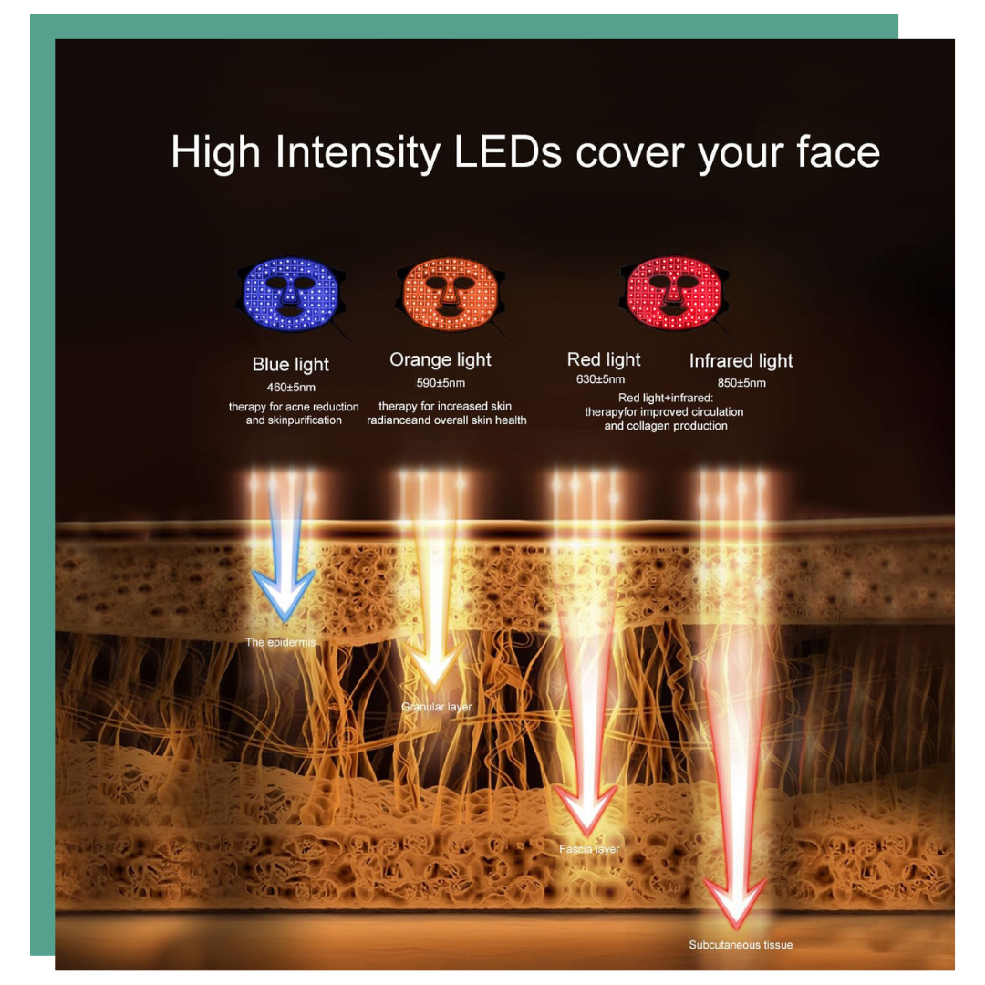 590nm (amber light) — Helps reduce inflammation, redness, and supports even skin tone.